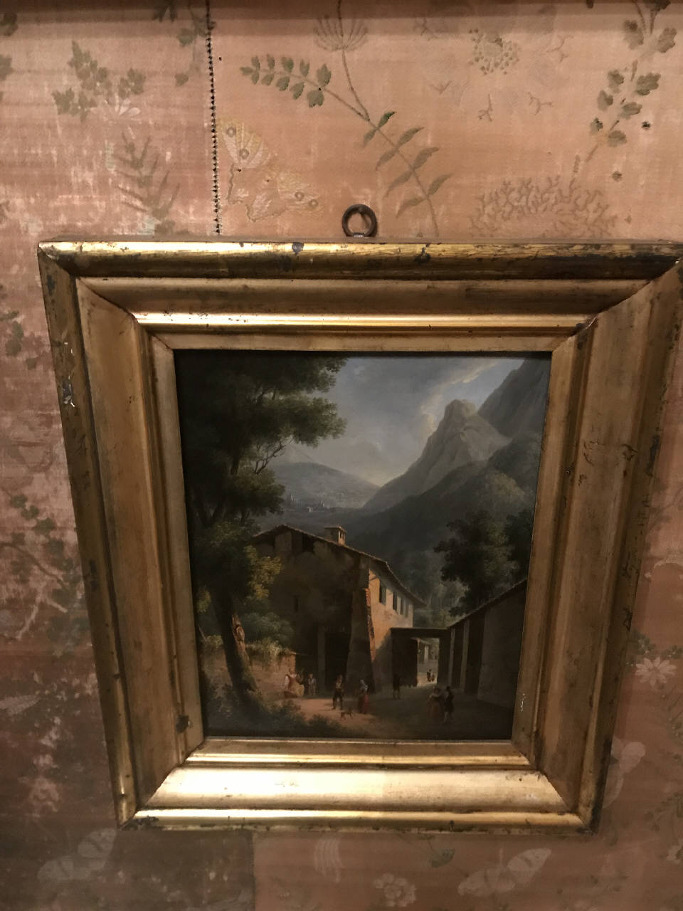 Il dipinto, a olio su tavola, è un paesaggio montano con figure. Di picco\nlo formato rettangolare, è orientato in verticale e dotato di una cornice\n lignea dorata.