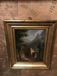 - NOTIZIE STORICO CRITICHE Il dipinto, a olio su tavola, raffigura un paesaggio montano. In primo piano, numerosi personaggi occupano la corte di un grande edificio in muratura, circondato da boschi verdeggianti e rilievi scoscesi. L¿ambientazione\n e lo stile dell¿opera sono da collegare alla pittura di paesaggio berga\nmasca del XIX secolo.
