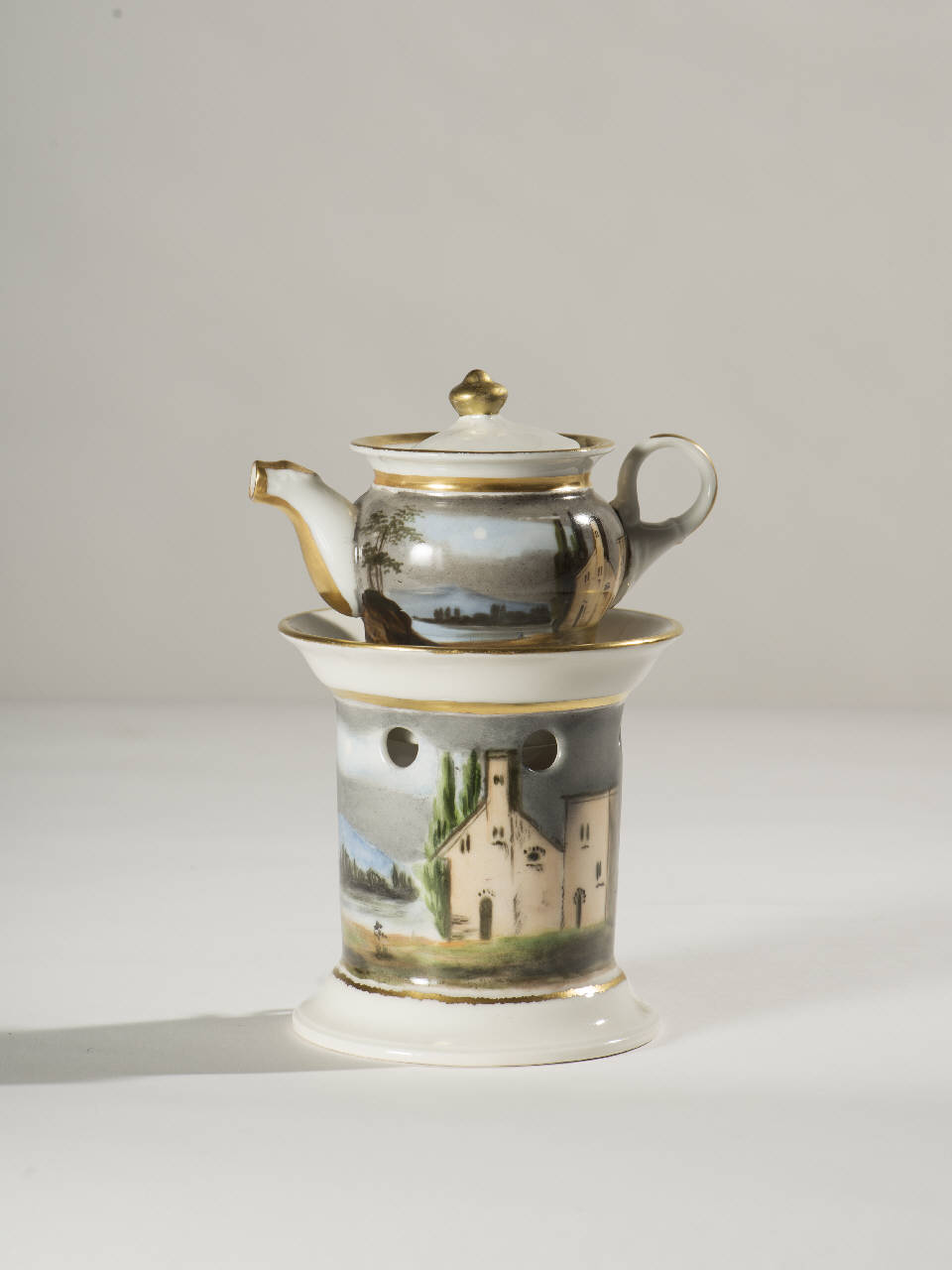Veilleuse a fondo bianco in porcellana dipinta a mano con decorazione sul fusto e sul corpo della teiera data da scorci di paesaggi; profilature dorate lungo gli orli, il beccuccio e il manico; pomolo dorato per il coperchio della teiera. Composta da quattro parti: fusto a sezione circolare con base ad anello, apertura inferiore per il godet, grandi fori circolari per areazione nella parte superiore, orlo superiore aggettante; godet posto all'interno del fusto; teiera dalla forma panciuta con invaso, orlo superiore espanso, manico ad anello, beccuccio lievemente mosso. Coperchio con presa a pomolo. Di fattura novecentesca che riprende modelli dell'800.