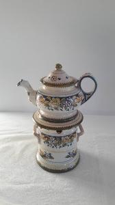 La veilleuse si compone di quattro elementi: fusto biansato a sezione cilindrica con allargamento inferiore, apertura per il godet nella parte inferiore, fori circolari per areazione nella parte superiore, orlo circolare superiore espanso; godet all'interno del fusto; teiera panciuta con invaso, becco mosso, orlo espanso, manico ad orecchio; coperchio con presa sferica. L'apparato decorativo è dato da motivi floreali presenti sul fusto e s\nulla teiera. Profilature per gli orli in giallo, blu, verde e terra bruciata. Di fattura novecentesca che riprende i modelli dell'800.