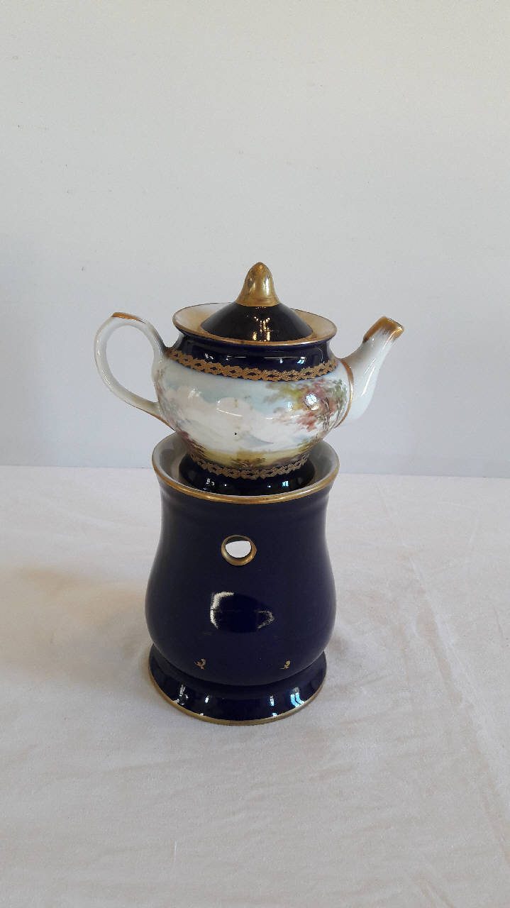 La veilleuse si compone di quattro elementi: fusto a sezione circolare, lievemente bombato nella parte inferiore, base ad anello rastremato verso l'alto, foro per il godet nella parte inferiore, fori per l'areazione nella parte superiore, orlo superiore espanso; godet posto all'interno del fusto; teiera con invaso dalla forma panciuta, con manico ad orecchio e beccuccio mosso; coperchio con presa a punta. Il fusto è interamente dipinto in \nblu cobalto; la teiera presenta l'apparato decorativo dato da piante che si stagliano su uno sfondo dato da nubi. Profilature dorate per gli orli, il pomolo del coperchio è interamente dorato. Motivi decorativi vegetali a\n rilievo e dorati delimitano lo spazio della raffigurazione sul corpo della teiera. Di fattura novecentesca che riprende i modelli dell'800.
