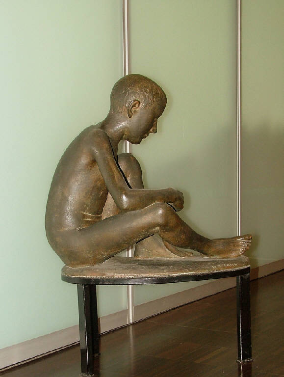 - NOTIZIE STORICO CRITICHE Agenore Fabbri, nato nel 1911 a Barba (Pistoia), plasma il proprio carattere artistico facendo pratica nei laboratori di ceramica di Albisola. La sua fortuna critica ha una prima affermazione a Spotorno, nel 1938, quando partecipa al Premio Bagutta. Orio Vergani, scrittore tra i primi ad interessarsi di "arti nuove", racconta del giovane e di "una sua statuetta di singolare vitalità nel suo modellato profondo e nervoso. Era un ragazzo biondo e ricciuto, con un viso ridente ma ogni tanto ostinato. Si notò subito che il suo primo merito, oltre a naturale virtù tecnica e della toscanissima dote dell'osservazione del vero, era quello di avere delle idee chiare, non solo in fatto di scultura a fuoco - allora non ne faceva ancora - ma anche per quanto riguarda la scultura maggiore. Erano anni di ardente polemica, quando Martini cominciava a dichiararsi stanco ed evadeva verso al pittura.\nArcaismo e cubismo si dividevano il cuore dei giovani, come del resto se lo dividono ancora. Fabbri, sulla memoria di quella statuetta esposta a Spotorno, fu ricordato anche a Milano, dove capitò dopo poco tempo. La guerra doveva farlo sparire quasi subito. Poco di lui si seppe, finché un giorno i ceramisti di Albisola poterono dire che finalmente avevano trovato per la loro arte, un uomo nuovo. Ed è di pochi mesi fa, per Agenore Fabbri, l'elogio più alto cui, in qualunque modo si possa pensarla in fatto d'arte, può aspirare un giovane: quello di Pablo Picasso, fattosi anche lui da qualche tempo artista della ceramica in una fornace della francese Costa Azzurra".\nE' quella l'opera dalla composizione pulita e sensuale, riflesso evidente della giovane stagione creativa dell'artista, riferibile a un momento di precoce attività scultorea dell'autore, antecedente alla temperie espressionista che ne caratterizzerà fortemente la produzione. Vi si individuano assonanze con il David accosciato di Giacomo Manzù, pressocché contemporanea (del 1938, il secondo bronzo è più tardo).