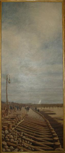 - NOTIZIE STORICO CRITICHE Il dipinto venne realizzato da Domenico Pesenti nel 1898 per l'imprenditore Luigi Valentini che lo commissionò per onorare la memoria dello zio Pietro Valentini, facendo illustrare i quattro principali lavori da lui compiuti come appaltatore di opere pubbliche: a questa tela si associano infatti anche Il ponte della diga Masetti e due opere oggi disperse, La Ferrovia Pontebbana e un soggetto non identificato. Dopo essere appartenuto alla collezione Valentini, il dipinto passò alla Raccolta Lasagna di Mantova per poi essere donato nel 1972 all'Ufficio del Genio Civile di Mantova, dove rimase insieme al suo pendant anche dopo il passaggio della sede alla Regione Lombardia.\nL'opera è rappresentativa della modernizzazione del territorio mantovano in atto nel corso del XIX secolo, a cui Pesenti dovette assistere al ritorno da un soggiorno fiorentino avvenuto tra il 1875 e il 1897: i dipinti di questa serie rappresentano infatti uno dei pochi contributi italiani nell'ambito della produzione di genere "industriale", originatasi sulla scia delle grandi trasformazioni nei territori inglesi, tedeschi e francesi degli anni '80 del XIX secolo, che portarono in pittura ad una tendenza di sentimentale apertura alla vita degli sfruttati, delle vittime dell'industria, tanto quanto ad un vivo interesse nella rappresentazione puntuale e dettagliata dei meccanismi e macchinari da loro utilizzati (Dalai Emiliani - Ginex, 1988).\nL'artista sembra qui voler imprimere nel dipinto la bellezza della nuova tecnologia in contrasto con il vecchio profilo urbano, sovrappondendo così lo sviluppo industriale moderno al paesaggio storico, il tutto accentuato dal taglio fotografico angolare ribassato che conferisce al quadro una forma allungata: con la sua abituale e meticolosa precisione Pesenti rende la natura morta del legname in primo piano, ponendo l'accento sulla sapienza del lavoro artigianale, volto a creare forme nuove per la città che avanza (Sisi, 2003).