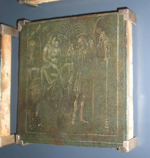 - NOTIZIE STORICO CRITICHE La tavoletta dipinta appartiene Collezione Verga, acquistata nel 2000 dalla Regione Lombardia dal collezionista Daniele Verga e poi depositata su suggerimento di Federico Zeri presso i Musei Civici di Pavia, per riunirla ad un'altra tavoletta (oggi divisa in due) raffigurante anch'essa "Storie della Vergine e di Cristo" e attribuibile allo stesso autore, un anonimo maestro lombardo della metà del XV secolo. Le sette tavolette nel loro insieme, erano probabilmente unite a formare gli scomparti di un dossale o di un altarolo portatile, come si evince dalla presenza di tagli e tracce di cerniere distribuite lungo i margini; inoltre la similarità con l'opera della Pinacoteca Malaspina ha fatto ipotizzare una loro collocazione con la funzione specifica di sportello e la conseguente doppia visione sia dal recto che dal verso (la tavoletta di Pavia è infatti dipinta a colori da un lato e a monocromo dall'altro) (Ottolenghi, 2000).\nL'ambito storico-artistico di appartenenza è quello di un maestro lombardo della metà del Quattrocento, ricollegabile alle opere tarde di Michelino da Besozzo, ma ormai aggiornato alla produzione tardogotica più moderna della bottega cremonese di Bonifacio Bembo, presente anche a Pavia (Tesori salvati, 2000): egli dipinge a monocromo, facendo emergere le sottili figure dal fondo scuro color malachite con sapienti pennellate più o meno cariche di biacca, il cui ductus si alterna a tratti parallelo e a tratti più libero e sciolto, secondo le modalità documentate nella produzione su tavola, affresco e miniature sviluppatasi nell'area settentrionale fra il II° e il III° quarto del XV secolo (Ottolenghi, 2000).