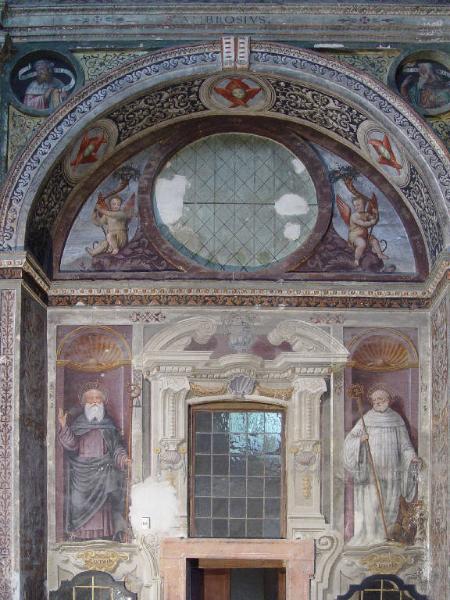 - NOTIZIE STORICO CRITICHE L'affresco si colloca nella quarta cappella da sinistra, in corrispondenza del passaggio tra la chiesa di S. Vittore e la relativa sagrestia, che consente anche l'accesso alla chiesa claustrale. L'opera è stata attribuita da Giovanni Agosti e Jacopo Stoppa (Tosi, 2014) a colui il quale raccolse l'eredità artistica e i cantieri di Bernardino Luini alla sua morte nel 1532, ovvero il cugino della moglie Giovanni Lomazzo. Residente in Meda già nel 1516, Lomazzo era soprattutto un pittore ad affresco, non particolarmente brillante ma molto responsabile nella gestione della bottega luinesca fino alla crescita dei figli di Bernardino (il più piccolo, Aurelio, alla morte del padre aveva 2 anni): a conferma di ciò, ancora nel 1595 viene ricordato con il soprannome "Giovanni Lovino" e descritto come un pittore dolce e accurato, allievo del più famoso Luini.\nL'affresco si presenta ad oggi molto danneggiato, tuttavia non vi sono dubbi nell'identificazione dei due santi rappresentati, sia per l'iscrizione presente ai piedi del basamento delle nicchie dove sono appoggiati, sia per la presenza dei loro caratteristici attributi iconografici. Il santo sulla sinistra è Antonio Abate, una delle più grandi figure dell'ascetismo cristiano antico, ritenuto "Padre dei monaci": vissuto in Egitto nel IV sec., all'età di vent'anni vendette tutti i suoi beni per condurre una vita da asceta, sopportando e superando qualsiasi tentazione, ma la sua fama si diffuse a tal punto che dovette abbandonare l'eremitismo per dedicarsi ai numerosi discepoli e alla lotta contro l'arianesimo, fino alla morte ultracentenario, avvenuta nel 356. Di norma, ed anche in questo caso, viene raffigurato vestito come un eremita con una campanella legata al bastone, e con un maiale ai suoi piedi (qui un cinghiale), simbolo del diavolo tentatore: a partire dal Medioevo infatti, il santo viene invocato contro l'herpes zoster (chiamato popolarmente, per l'appunto, "fuoco di Sant'Antonio"), una malattia virale a carico delle terminazioni nervose che per molti secoli venne curata dai monaci Antoniani preparando con il lardo suino un balsamo che, secondo le credenze, era in grado di guarire i malati.\nIl santo sulla destra è invece Bernardo da Chiaravalle, fondatore dell'ordine cistercense: egli nacque in una ricca e nobile famiglia di Digione nel 1090, entrò nell'Ordine benedettino presso il monastero francese di Citeaux all'età di 22 anni e già nel 1115 divenne abate di una nuova fondazione a Clairvaux, da cui poi si originarono molte altre sedi. Inizialmente criticato per la sua eccessiva durezza, Bernardo rivide le condizioni di vita richieste ai monaci, riducendo loro il tempo dedicato alla preghiera e aumentando il lavoro, ma anche migliorando il cibo e consolidando la posizione del monastero come istituzione sul territorio. Per i suoi numerosi scritti viene considerato un Padre della Chiesa. Iconograficamente viene, come nel presente dipinto murale, raffigurato con l'abito bianco dei Cistercensi e il pastorale abbaziale; ai suoi piedi il demonio incatenato, simbolo della vittoria sulle tentazioni.