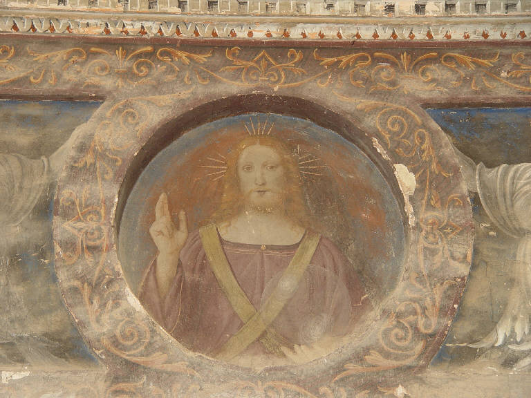 - NOTIZIE STORICO CRITICHE I tredici affreschi raffiguranti Gesù e gli Apostoli a mezzobusto, sono posti sul cornicione dell'ex chiesa claustrale di S. Vittore, attualmente sconsacrata e facente parte degli ambienti privati di Villa Antona Traversi: dopo la soppressione del monastero, per poter adibire l'aula a zona di servizio, l'architetto Leopoldo Pollack fece soppalcare la chiesa interna creando i due ambienti della "Limonera", al piano terra, e della "Sala del coro", al piano superiore. Qui è ancora visibile la decorazione pittorica realizzata da Bernardino Luini per la parte di chiesa originariamente adibita alle sole monache, databile tra il 1520 e il 1525. In linea con quanto affrescato nella parte pubblica, anche nella chiesa claustrale il cornicione è decorato con raffigurazioni di santi e apostoli a mezza figura, entro tondi e rombi: questa decorazione fu coperta dalla calce dopo la sconsacrazione dell'edificio e descialbata solo nel 1992, il che motiva in parte il pessimo stato di conservazione in cui versano le pitture sulle pareti dell'intera aula.\nPer quanto riguarda la scelta dell'artista di inserire ritratti di personaggi sacri all'interno di cornici tonde o quadrangolari, essa è riconducibile ad una tradizione secolare di raffigurazione delle personalità eminenti, che ebbe origine in epoca classica: l'"imago clipeata", immagine onorifica per eccellenza, trascorse dall'orizzonte greco fino a quello romano, passando dalle serie di clipei (medaglioni rotondi) con eroi mitologici e uomini illustri appesi nei templi greci, alle immagini degli antenati delle famiglie patrizie di Roma, dove questo tipo di rappresentazione si allargò alla sfera privata oltre che a quella pubblica. Con la fine del periodo antico, l'imago clipeata divenne un privilegio riservato all'iconografia dei santi, forse spiegabile anche con l'affinità tra la forma del tondo e quella del nimbo-aureola: in particolare, a partire dal IV sec. d.C., sull'esempio delle "gallerie di uomini illustri" romane (in cui erano raffigurati imperatori, oratori, medici, ecc...) i cristiani iniziarono a comporre serie da dodici o tredici tondi, come la presente, raffiguranti Cristo e gli Apostoli.