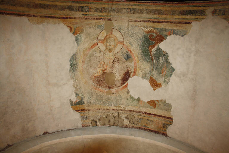 - NOTIZIE STORICO CRITICHE La volta a botte del presbiterio è occupata da affreschi alto medievali, contornati da eleganti incornciature geometriche con raffigurazioni fitomorfe e zoomorfe molto curate nei particolari, nelle quali si uniscono elementi di spiccato gusto naturalistico ad altri di più complesso significato simbolico. \nLa figura di Gesù posta al centro è stata ricondotta all'iconografia del "Cristo giudice" non tanto per la presenza di un volume aperto retto con la mano sinistra, quanto per la particolare configurazione della mano destra, raffigurata in alto davanti al busto, con il palmo rivolto verso lo spettatore, in posa diversa rispetto a quella tradizionalmente benedicente "all'orientale" (ovvero chiusa con il dito indice e il medio sollevati). Durante tutta la seconda metà del Medioevo, il tema iconografico del Giudizio Universale ha occupato i soggetti dell'arte cristiana sia occidentale che orientale: l'immagine di Gesù che separava i dannati dagli eletti era infatti la prima immagine che il fedele vedeva entrando in chiesa o, viceversa, l'ultima che si presentava ai suoi occhi sulla controfacciata prima di uscirvi. Il "Cristo giudice" seduto su un trono o circondato dalla sua corte celeste, costituiva a tutti gli effetti una sorta di teofania, ovvero una visione di Dio nella sua gloria, all'interno di uno squarcio apertosi nel cielo sotto forma di una mandola di luce. Nella presente opera Cristo viene dipinto all'interno di un clipeo (spazio circolare di derivazione romana) sullo sfondo di un cielo stellato, intorno al quale si dispongono numerosi singolari elementi di dimensioni modeste, di colore rosso e azzurro chiaro delimitati di bianco, che originariamente dovevano essere dodici (sei per lato). Ognuna di queste forme, apparentemente identificabile solo come un profilo concavo ondulato culminante al centro con un picco, costituisce ancora oggi un elemento di difficile identificazione: potrebbe trattarsi di una raffigurazione puramente decorativa, oppure, data l'alta qualità anche concettuale del dipinto, di un riferimento a dodici corpi astrali, forse connessi con i simboli zodiacali.\nAttorno alla figura di Gesù restano inoltre diverse tracce dei "tetramorfi" (i quattro simboli degli Evangelisti), di cui solo il simbolo di San Giovanni si è abbastanza ben conservato. L'immagine dell'aquila risulta realizzata con grande eleganza e maestria e nuovamente si mostra caratterizzata da una equilibrata commistione di elementi ripresi dalla natura con parti ideate senza vincoli al dato reale. Soprattutto l'esecuzione delle ali dell'uccello è frutto di una pennellata rapida e sicura, senza ripensamenti, e nello stesso tempo lieve nel tocco, opera di un artista in grado di esprimere con notevole efficacia anche i particolari più minuti. La straordinaria e originale qualità di questa porzione del dipinto ha concorso nel denominarne l'anonimo esecutore con l'intitolazione di "Maestro dell'Aquila".\nL'estrema lacunosità degli affreschi ha presentato un notevole ostacolo per l'attribuzione degli stessi e per l'identificazione di una precisa cronologia di riferimento. La sovracitata iconografia del "Cristo giudice" non sembra distaccarsi dal consueto modo di impostare l'immagine sacra, tuttavia la capacità tecnica, l'inventiva e la libertà espressiva con cui vengono qui dipinti tutti i riferimenti simbolici, pone l'artista che ha realizzato questo dipinto in posizione di rilevanza rispetto a tutte le altre pitture superstiti della chiesa, collocate nella parete nord della navata maggiore. Ciò corrisponderebbe anche all'abitudine dei committenti di riservare al presbiterio, la parte più sacra della chiesa, la massima cura nella realizzazione e dunque la scelta, per affrescare quella zona, delle migliori maestranze. Anche dal punto di vista cronologico è da ritenersi che al momento in cui vennero realizzati gli affreschi della navata, quelli sopra l'altare fossero già stati ultimati o in via di completamento.\nMolti sono i riferimenti suggeriti dalla critica circa la vicinanza di questa decorazione pittorica con esempi di pittura ad essa coevi (Zastrow, 1991). Sono state proposte analogie con la chiesa di S. Giorgio a Reinchenau Oberzell della fine del X secolo, nonostante le sue figure appaiano meno dure rispetto a quelle di Agliate. Un altro interessanete confronto è stato fatto con la decorazione della chiesa di S. Vicenzo a Galliano, con cui esistono evidenti connessioni stilistiche, e con il complesso di S. Pietro a Civate, che mostra invece come mano a mano ci si inoltri nell'XI e XII secolo, le nuove valenze bizantineggianti vadano a cancellare la cultura figurativa tardo carolingia. Sulla base di queste considerazioni la critica ha ritenuto di poter considerare le opere della chiesa di Agliate più correttamente inquadrabili nel pieno X secolo piuttosto che in quello successivo, in quanto ancora fortemente ancorate al gusto romanico.