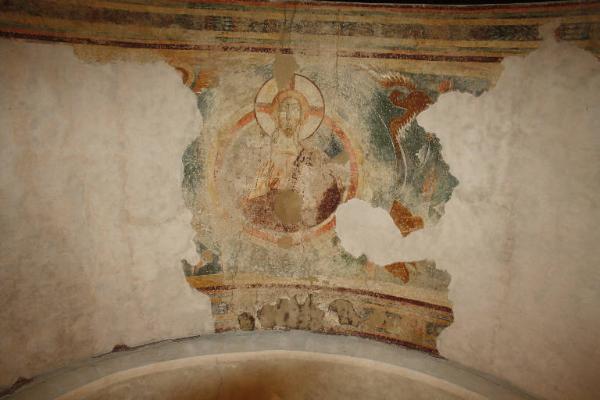 Dipinto murale raffigurante l'immagine di Cristo Giudice che regge nella mano sinistra un volume, mentre la mano destra è sollevata, con il palmo rivolto verso l'osservatore. Gesù, raffigurato a mezzo busto in posizione perfettamente frontale, è inserito in una cornice circolare sullo sfondo di un cielo blu cobalto punteggiato di piccole stelle ed è circondato ai quattro lati da lacerti delle figure simboliche degli Evangelisti. L'unica attualmente visibile pienamente è l'aquila di San Giovanni, collocata nell'angolo in alto a destra. L'intera volta è delimitata alle estremità superiori e inferiori da una fascia policroma riccamente decorata.