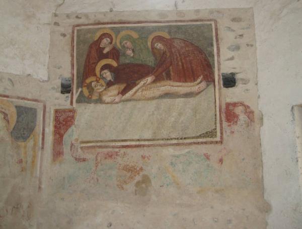 Dipinto murale inserito in una cornice dipinta di colore rosso, di formato rettangolare con orientamento orizzontale. L'affresco raffigura una scena di "Deposizione", dominata dal gesto della Maddalena che, afferrando le mani di Cristo disteso, sembra cercare di sollevarlo o sostenerlo. Il corpo di Gesù, interamente segnato da piccole macchie di sangue, giace disteso sopra una pietra rettangolare di colore chiaro, mentre la Madonna si china sopra di lui in lacrime, reggendogli il capo con la mano destra. Dietro Maria sono visibili altre due donne con il volto sofferente e le mani giunte in preghiera. Nella parte bassa il dipinto è bocciardato e mostra lateralmente i segni di un altro affresco sovrappostogli in epoche successive: di questo dipinto rimangono visibili il profilo di una Santa Lucia nell'angolo in basso a sinistra, e quello di una donna inginocchiata e riccamente vestita, benchè di piccole dimensioni, nell'angolo in alto a destra.