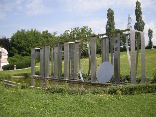 Scultura astratta, costituita da numerose lastre d'acciaio modellate a raffigurare forme geometriche saldate l'una all'altra: la struttura che ne deriva è un gigantesco parallelepipedo che si sviluppa in lunghezza, aperto su tutti i lati e ritmato al suo interno dall'alternarsi di sbarre, cerchi ed altri elementi geometrici. L'opera è installata sopra una vasca di recupero per l'acqua piovana.