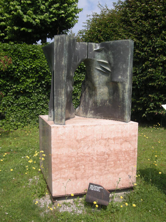 Scultura astratta costituita da due elementi modellati in bronzo, piuttosto spessi e dalla forma irregolare, a tratti sporgenti e ricchi di creste, a tratti concavi e ondulati, poggiati sopra una base di forma cubica in marmo rosa.