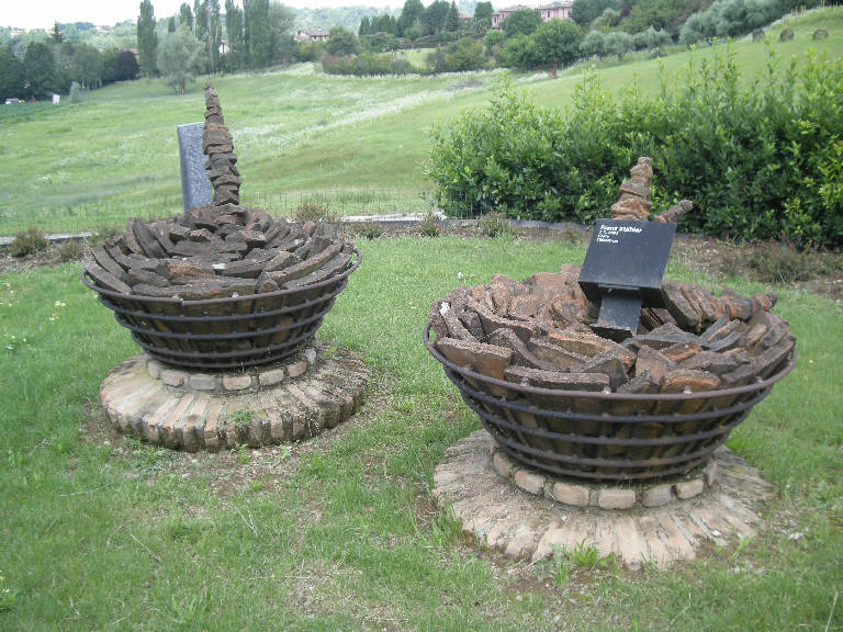 - NOTIZIE STORICO CRITICHE L'opera, realizzata da Franz Stähler nel 2004, è stata da lui donata alla collezione di scultura contemporanea della Fondazione Pietro Rossini. Il contatto tra l'artista e Alberto Rossini avvenne in maniera casuale verso la metà degli anni Ottanta, in seguito ad una serie di viaggi di lavoro effettuati in Germania dall'imprenditore brianzolo. Durante uno di essi Rossini conobbe il padre dello scultore, all'epoca molto giovane e non ancora affermato. Incuriosito dai suoi lavori, Rossini rimase in contatto con lui e quando l'artista si trasferì a Faenza nel 1986, lo invitò per lunghi periodi a casa sua, mettendogli a disposizione tutto l'occorrente per lavorare. Tutte le opere di Stähler presenti nel Parco di sculture della Fondazione sono dunque site-specific, ovvero create appositamente per questa sede e scrupolosamente collocate in essa dall'artista, dopo un attento studio dei parametri ambientali circostanti.\nLa ricerca artistica di Stähler parte dalla corrente italiana dell'Arte Povera e dalle diverse esperienze che orbitarono intorno ad essa a partire dalla creazione del movimento nel 1967. Fulcro e motore dell'opera è il materiale scelto per la sua realizzazione, essenzialmente di natura povera e profondamente legato alla terra. Il ferro, il legno, la ceramica, il mattone, vengono modellati direttamente dall'artista che li eleva a materie prime dell'arte. Opere esemplari di questo provesso creativo sono i due "Cesti" contenenti mattoni rossi di recupero, accuratamente disposti al loro interno per realizzare un nuovo insieme formale che punta a creare una sorta di piramide. Le opere sono disposte a terra, senza alcun piedistallo, come se si trattasse di rovine antiche, di reperti archeologici che spuntano dal terreno per trovare una nuova dimensione nel mondo moderno.