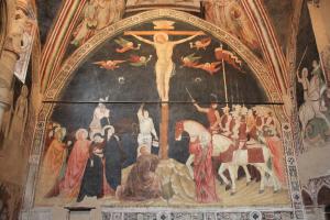 Dipinto murale collocato nella parete di fondo del presbiterio, raffigurante una "Crocifissione", contornato da una elaborata cornice che alterna racemi vegetali a motivi geometrici e tondi polilobati. Al centro viene dipinto Cristo in croce, circondato da sei angeli multicolori che volano nel cielo di colore scurissimo, quasi nero. Ai piedi della croce Stefano regge nella mano sinistra un secchiello mentre con la destra allunga verso Gesù la spugna con l'aceto. Ancora più in basso, la Maddalena inginocchiata a terra abbraccia i piedi della croce, rivolgendo lo sguardo verso Cristo. In basso a sinistra le pie donne si avvicinano alle tre Maria, dove la Vergine è svenuta e viene sostenuta tra le braccia dalle altre due. Dietro di loro appare a cavallo il soldato Longino, con in mano la lancia che trafisse il costato di Gesù. A destra, in primo piano, appare San Giovanni dolente con le mani giunte, mentre alle sue spalle si schiera un folto drappello di soldati romani a cavallo (in realtà abbigliati come cavalieri medievali), guidati da un centurione.
