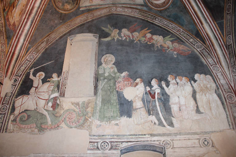 Dipinto murale collocato sulla parete destra del presbiterio, contornato da una elaborata cornice che alterna racemi vegetali a motivi geometrici e tondi polilobati. L'opera raffigura al centro Stefano Porro, inginocchiato, che offre al suo patrono, in piedi con indosso una veste verde, il modellino dell'oratorio. Dietro di lui appare la moglie, Caterina Figini, i tre figli maschi - Antonio, Galeazzo e Giovanni -, e per ultime le tre figlie, sull'estrema destra della composizione. Al di sopra della famiglia volteggia un gruppo di angeli multicolori che regge corone floreali e melograni, un globo d'oro, una corona e una bacchetta bianca, simboli del potere di cui si voleva la leggitimazione divina per la famiglia Porro. Una finestra murata posta sulla sinistra della composizione, separa la scena della donazione dalla raffigurazione di San Giorgio a cavallo che lotta contro il drago per salvare la principessa.