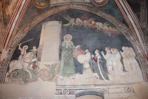 - NOTIZIE STORICO CRITICHE Il soggetto raffigurato nel dipinto, Stefano Porro, proveniva da una famiglia ghibellina fedele ai Visconti fin dal XII secolo: egli intraprese dal 1360 una brillante carriera politica come funzionario a fianco di Bernabò e di Galeazzo II Visconti, muovendosi tra Milano, dove possedeva un'abitazione, e Pavia. Stefano raggiunse il vertice della sua carriera divenendo "secretarius", ovvero membro del Concilio Segreto di Galeazzo II e il suo più grande successo fu la missione presso l'Imperatore Carlo VI del 1367-68, quando riuscì a scongiurare che il boemo si mettesse a capo di una lega anti-viscontea, come voleva Papa Urbano V, e a far confermare ai Visconti il titolo di vicari imperiali. Lo stesso giorno che fu siglata la pace, il 27 agosto 1368, Porro fu eletto Conte Palatino e decise di far erigere un oratorio privato nella sua terra natia, Lentate sul Seveso, dedicandolo al suo omonimo santo. Anche i tre figli maschi Antonio, Galeazzo e Giovanni, qui raffigurati dietro ai genitori, proseguiranno la strada paterna presso la corte viscontea.\nQuesto affresco si mostra particolarmente interessante sia per l'attenta trattazione degli abiti, realizzati secondo la moda del tempo, sia per la presenza di un modellino dell'oratorio, che costituisce un interessante documento delle trasformazioni esterne subite nei secoli dall'edificio. La chiesa viene infatti disegnata in modo molto dettagliato, così da mostrare, oltre al fronte principale, anche l'intero lato meridionale, oggi nascosto da una serie di corpi che vi addossano: tale parete viene divisa dalle lesene in cinque parti, mentre nella realtà vi è una lesena in più e le finestre sono sono centrate come invece appare nell'affresco. Il modellino mostra chiaramente anche la finestra aperta nel presbiterio (oggi murata), mentre una lacuna e la posizione della barba del committente non permettono di capire se vi fosse dipinta anche la porta sottostante (Pracchi, 2007).\nIl dipinto si ritiene opera di personalità indicate dalla critica con il generico appellativo di "Maestri di Lentate", una bottega di artisti che lavorò a stretto contatto con l'autore della volta del presbiterio. Questi artisti accentuarono, rispetto alle vele, i ritmi lineari e la forza della linea di contorno, concentrandosi sulla precisa descrizione dei particolari delle vesti e delle capigliature, ma trascurando il modellato e semplificando la schematizzazione dei panneggi. La loro pittura è ovviamente più rozza rispetto a quella del "Maestro delle Vele", più orientata verso lo stile grafico che prelude il tardo gotico piuttosto che verso il severo giottismo delle pitture della volta. Il loro riferimento non è dunque soltanto la pittura monumentale fiorentina, ma la miniatura che nell'ultimo quarto del XIV secolo assumerà in Lombardia il ruoto di arte-guida. Lentate non fu del resto l'unica occasione per questi maestri di lavorare insieme, infatti la critica ritiene che anche gli affreschi realizzati nel vicino oratorio di Birago da Solaro tra il 1363 e il 1367 possano essere attribuiti alla stessa mano che operò a Lentate, per via della vicinanza tra alcune figure femminili del presbiterio di Solaro e le figlie di Stefano Porro dipinte a Lentante. Il loro sodalizio continuò poi anche a Milano in un'impresa commissionata direttamente dai Visconti, ovvero la decorazione della cappella di S. Tommaso d'Aquino (1375-80) nella chiesa di S. Eustorgio (Galli Michero, 2008).\nCome narrato nella lapide del sepolcro murata sulla parete sinistra del presbiterio, la decorazione pittorica venne eseguita in occasione dell'erezione della chiesa nel 1369 e dovette sicuramente terminare prima del 1375, data graffita nelle murature decorate e rinvenuta in occasione dell'ultimo restauro del 2006. Durante tale campagna anche su questo affresco si è rilevata la presenza di pontate, non di giornate, segno di un procedere esecutivo molto rapido che potrebbe sottintendere il 1369 come data di conclusione dell'impresa e di inaugurazione del complesso.\nLe analisi visive e le mappature effettuate sullo stato di conservazione degli affreschi durante la campagna d'indagine preliminare al restauro, hanno portato a definire più chiaramente anche la tecnica d'esecuzione e i materiali costitutivi del dipinto. Su un intonaco molto ben lisciato sono state disegnate con la punta di un compasso i profili dei santi con le aureole e le strutture geometriche, mentre i particolari delle figure e delle architetture sono stati disegnati direttamente a pennello con dell'ocra rossa. Gli incarnati sono stati realizzati con stesure successive dalla più scura alla più chiara su una preparazione di terra verde, rinforzate nei profili con una sottile linea bruna e lumeggiate con corpose pennellate di bianco di S. Giovanni. Le vesti sono realizzate con stesure di colore più scuro sopra una preparazione chiara su cui vengono già definite le ombreggiature, cui si aggiungono nell'ultima fase alcune stesure trasparenti (Pracchi, 2007).