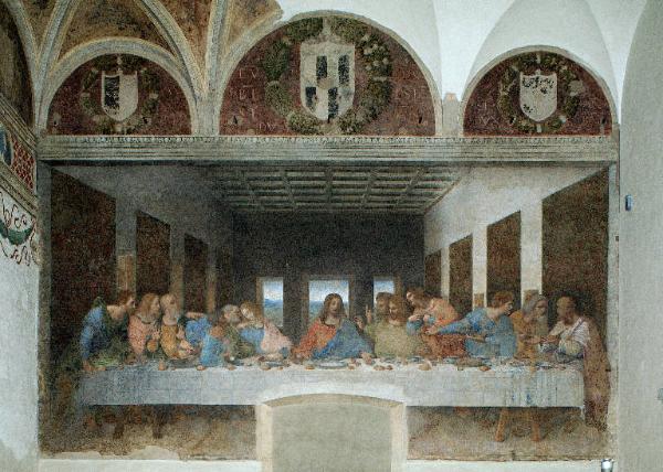 - NOTIZIE STORICO CRITICHE Vertice dell'attività pittorica di Leonardo da Vinci durante il suo primo soggiorno milanese (1482-1499), il dipinto dell'"Ultima Cena" fu realizzato dall'artista fiorentino tra il 1495 e il 1498, presso il convento domenicano di Santa Maria delle Grazie, all'interno del refettorio, oggi più comunemente conosciuto come Cenacolo vinciano. La commissione è da riferirsi al duca di Milano Ludovico il Moro, come parrebbero attestare le tre lunette soprastanti il dipinto murale con le insegne ducali circondate da ghirlande di fogli e frutti, mentre il tema dell'Eucaristia fu forse suggerito dai monaci stessi. L'opera costituisce una sorta di manifesto della pittura leonardesca degli anni milanesi, infatti in esso l'artista condensa tutti i suoi studi sui "moti dell'animo", sull'acustica, sulla prospettiva e sulla propagazione della luce. Attraverso alcuni accorgimenti prospettici, Leonardo creò uno sfondamento nella parete settentrionale del refettorio, dilatandone la spazialità ma rimanendo ancorato all'ambiente monastico di cui vennero idealmente riprese e continuate le linee delle pareti, nonché la fonte luminosa costituita dalle reali finestre aperte sulla parete occidentale della sala. \nDal punto di vista della tecnica esecutiva, in assenza di testimonianze di un qualsiasi cartone o modello originale dell'artista, è stato ipotizzato che Leonardo abbia steso direttamente i suoi pensieri sull'intonaco della parete con il pennello intriso di bistro, variando di getto e all'improvviso posizioni e atteggiamenti dei personaggi, già assestati su una numerosa serie di studi e disegni. Durante il recente restauro sono state ritrovate tracce di gessetto rosso sotto la preparazione, che riflettono la sua predilezione a tradurre graficamente i pensieri, tracciando uno schema destinato a definire le masse. Un disegno di progetto, dunque, realizzato prima della stesura della preparazione e dell'imprimitura, come si trattasse di una grande tavola. A dispetto dell'eccezionale fortuna critica del dipinto, però, l'opera iniziò già a partire dal XVI secolo a deteriorarsi, per via della particolare tipologia di materiali utilizzati dall'artista: in sostituzione del canonico "buon fresco", che Leonardo non gradiva a causa della necessità di un'esecuzione troppo rapida, egli stese più strati di tempera grassa su due differenti preparazioni, una più grossolana a contatto con la parete e una gessosa su cui fecero presa i colori. Questo tipo di sperimentazione, che gli diede l'opportunità di intervenire a più riprese per cambiare e aggiustare i dettagli dell'immagine, non ebbe però un buon esito conservativo, provocando fin da subito il distaccamento e la perdita della pellicola pittorica.\nLa storia del Cenacolo è infatti caratterizzata da un susseguirsi continuo di interventi di restauro, operati nel Settecento, nell'Ottocento e in almeno tre differenti campagne del Novecento, che spesso hanno contribuito solo ad alterare ulteriormente la già fragile superficie dipinta. In aggiunta a quanto fatto durante la dominazione napoleonica, nella quale il refettorio venne trasformato in una stalla, il Cenacolo vinciano subì numerosi danni a causa dei bombardamenti della Seconda Guerra Mondiale, durante la quale il dipinto fu coperto con dei sacchi e salvato così da danni irreparabili. L'ultimo intervento, protrattosi per 17 anni (dal 1982 al 1999) è stato curato dalla restauratrice Pinin Brambilla Barcilon, che ha riportato in luce sotto infiniti strati di colle, stucchi, ridipinture e sporco superficiale, ciò che di originale era rimasto dell'opera leonardesca, intervenendo tanto sull'adesione della pellicola pittorica al supporto quanto sulla reintegrazione delle enormi lacune, operata ad acquarello con l'intento di raggiungere una sorta di equilibrio cromatico d'insieme.
