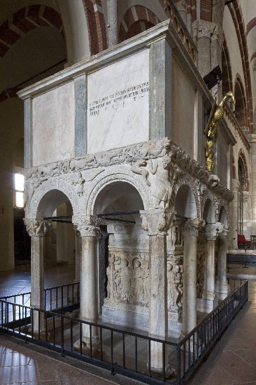 - NOTIZIE STORICO CRITICHE L'ambone di Sant'Ambrogio costituisce l'unico pulpito medievale conservato in una chiesa di Milano, nonché un mirabile esempio d'insieme scultoreo, al pari dei capitelli e dei rilievi del portale della basilica. Un'iscrizione presente su una delle lastre marmoree chiarisce che l'opera venne realizzata da Guglielmo da Pomo in seguito al crollo del primitivo pulpito avvenuto nel 1196, e che i lavori potevano considerarsi conclusi nel 1201. Tale lavoro non consistette però nella realizzazione di alcuna scultura, bensì solo in una ricomposizione di parti al fine di recuperare lo stupendo fregio. In quell'occasione sicuramente vennero utilizzati materiali provenienti da quello danneggiato, ma per la sua ardita composizione fu necessario anche recuperare marmi dalla basilica più antica, con differenti elementi tipologici e diversi soggetti.\nPer quanto riguarda le figure in metallo sbalzato che ornano l'ambone non si conosce né la loro datazione né la loro provenienza, tanto che molti studiosi mettono in discussione la loro provenienza dall'ambone originario).\nTra le soluzioni più originali ed ardite per l'epoca è certamente la decisione di collocare la ricostruita struttura in modo che fosse visibile il Sarcofago di Stilicone sottostante, una delle poche testimonianze rimaste della costruzione basilicale originale voluta da Ambrogio. L'antico monumento infatti si trova nella posizione attuale fin dal IV secolo ed è orientato come gli altri resti dell'antica basilica, al contrario dell'ambone posizionatovi sopra, che invece segue la disposizione dell'asse dell'edificio medievale. Importato probabilmente da Roma o prodotto da artefici dipendenti dalla cultura romana, la tradizionale denominazione del monumento deriva dalla convinzione che l'altare maggiore contenesse le spoglie di Stilicone, comandante militare dell'Impero Romano d'Occidente. Al centro dell'alta fronte del coperchio è infatti scolpito un medaglione sorretto da due amorini, al cui interno sono effigiati i coniugi defunti. La figura maschile indossa una corazza ricoperta da clamide tipica delle alte autorità militari e rivolge lo sguardo alla moglie, appoggiata al suo braccio, elegantemente acconciata e ornata da gioielli.