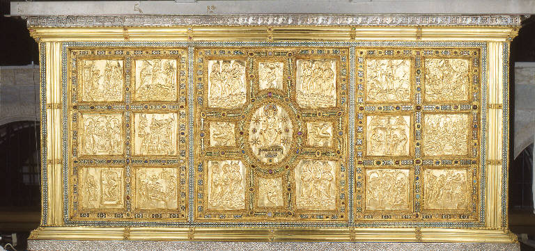 L'altare della basilica di Sant'Ambrogio è costituito da un grande "cofano" rivestito di lastre metalliche istoriate, nelle quali si sommano le tecniche dello smalto, dell'oreficeria e della lavorazione a sbalzo di oro (sulla faccia rivolta verso la navata) e d'argento dorato (sulla faccia rivolta verso l'abside e sui due lati minori). A dividere le facce dell'altare in scomparti, una serie di fasce di smalti lavorati a "cloisonnè" con prevalenza dei colori verde, azzurro, bianco, rosso e porpora. \nLa fronte rivolta verso i fedeli ospita al centro l'immagine di Cristo in gloria seduto sul trono con la croce come scettro, circondato dai simboli degli evangelisti e dagli apostoli a gruppi di tre. I due sportelli laterali, ospitano dodici storie tratte dai Vangeli. I fianchi laterali furono dedicati a raffigurazioni di santi vescovi e martiri. Infine la parte ad uso esclusivo del clero fu ornata al centro con uno sportello con due ante apribili, decorato con quattro tondi istoriati raffiguranti, nella parte alta, gli Arcangeli Michele e Gabriele, e in basso, Ambrogio che incorona Angilberto II e lo scultore Volvinio. Gli altri due sportelli laterali, anch'essi divisi ognuno in sei riquadri, ospitano dodici episodi della vita di Sant'Ambrogio.