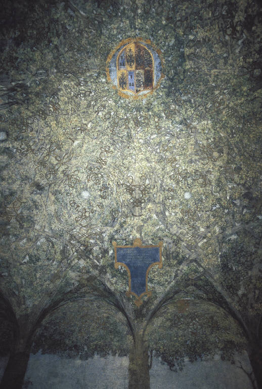 - NOTIZIE STORICO CRITICHE Considerata uno degli ambienti più illustri del Castello Sforzesco, la "Sala delle Asse" è situata al piano terra della torre angolare nord, ed è oggi parte del percorso interno del Museo d'Arte Antica. \nLe prime notizie sulla decorazione interna della sala risalgono al 1469, all'epoca di Galeazzo Maria Sforza, quando alcuni documenti descrivono la stanza come dipinta interamente di rosso ed ornata da decorazioni di tipo araldico (secchie e cimieri), che dovevano renderla molto simile ad una delle stanze attigue: la "Sala delle Colombine". L'attuale denominazione deriva da un successivo progetto decorativo, databile 1473, per il quale l'ingegnere ducale Bartolomeo Gadio proponeva di foderare la sala di "assi", con la relativa grande difficoltà di sagomare e adattare il legno alla curvatura della volta, forse poi dipinte in azzurro e oro.\nL'attuale aspetto si deve ad un intervento ancora successivo, risalente all'aprile 1498, quando Leonardo da Vinci si impegnò a realizzare entro il settembre di quello stesso anno per Ludovico il Moro, la seconda grande impresa decorativa murale milanese dopo il "Cenacolo". Le "asse" di rivestimento vennero rimosse per permettere all'artista di operare sulle pareti, ma ad oggi non è possibile stabilire se in soli cinque mesi, seppur con il concorso di indubbi aiuti provenienti dalla sua bottega, Leonardo portò effettivamente a termine l'intera decorazione. Sicuramente il lavoro non può essere proseguito oltre il 1499, quando il Moro fu costretto a fuggire da Milano per l'arrivo dell'esercito francese, e Leonardo stesso tornò a Firenze.\nIndubbiamente la grandiosa concezione d'insieme della sala, organizzata su vari livelli di lettura - araldico, politico, simbolico - si deve alla mente del genio vinciano. Negli intrecci di corde dorate che uniscono i rami di gelso, è possibile riscontrare una rielaborazione di quei "giochi" geometrici che tanto interessarono l'artista, forse iniziato al mondo delle rappresentazioni dei solidi dalla frequentazione con il matematico Luca Pacioli, per il quale illustrò il volume "De divina proportione" (1496-1497). Tipicamente suo anche lo spiccato interesse per la rappresentazione del mondo naturale, qui intrecciato con precisi significati di tipo simbolico. La scelta di dipingere l'albero del gelso (in latino Morus) era infatti allusiva sia della personalità del committente (Ludovico Maria Sforza detto il Moro) quale sostegno del ducato, sia dell'importanza della pianta stessa per l'economia milanese, fondata all'epoca sull'industria della seta. Un altro livello interpretativo vede nel pergolato dipinto la rappresentazione dell'armonia che nasce dal caos naturale, qui esemplificato dalle stratificazioni rocciose dipinte a monocromo nella parte inferiore della decorazione. Leonardo avrebbe qui, dunque, raffigurato la valle di Tempe, luogo di delizie tanto caro alla letteratura classica. Infine nei tronchi nodosi che risalgono sulle pareti sono stati rilevati rapporti con le colonne-tronco basate sul principio di architettura "naturale" desunto dagli scritti di Vitruvio, che l'architetto Bramante utilizzò nella canonica di Sant'Ambrogio: in questa impresa è stata ipotizzata la diretta partecipazione di Leonardo, che infatti studiò il motivo dell' "albero-colonna", in cui natura e architettura si fondono l'uno nell'altro, in un disegno del Codice Atlantico.\nNei secoli tuttavia, l'importanza della sala è andata scemando. Trascurata dalla critica, in epoca imprecisata venne nascosta sotto un pesante strato di intonaco, da cui riemerse solo nel 1894 in occasione dei lavori eseguiti sul Castello Sforzesco di Milano dall'architetto Luca Beltrami. La sala venne ripristinata ad opera del pittore Ernesto Rusca ed aperta al pubblico nel maggio 1902, ma tale intervento risultò così invasivo da essere poi rimosso durante la campagna di restauri effettuata nel secondo dopoguerra, che liberando le pareti dalla spalliera lignea collocata dal Beltrami portarono alla scoperta dei monocromi sulle pareti. Una seconda spalliera lignea fu invece collocata sulle pareti negli anni Cinquanta del Novecento dallo Studio BBPR nell'ambito di un riallestimento museale delle varie sale del Castello. Tale rivestimento è stato rimosso in occasione dell'inizio della nuova campagna di restauri iniziata nel 2006 con una serie di indagini preventive sul dipinto. Il cantiere, ancora in corso d'opera, ha portato alla scoperta di nuovi lacerti di monocromi e mira a restituire al dipinto una corretta leggibilità nel rispetto delle più aggiornate istanze di restauro e conservazione.