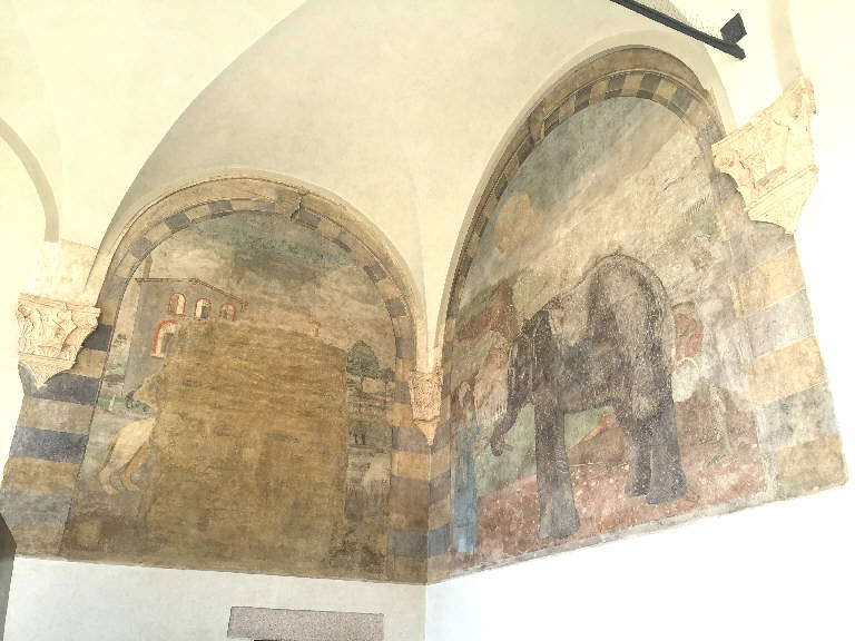 La campata sinistra, maggiormente danneggiata, mostra sulla sinistra le zampe posteriori di un leone, oltre il quale si colloca il profilo scuro di un uomo a cavallo e un edificio residenziale, con tetto a capanna dotato di comignolo e di due file di aperture ad arco profilate in mattoni nella parte superiore. Sulla destra invece era probabilmente raffigurato in primo piano un gruppo di personaggi oggi purtroppo quasi del tutto perduti; in secondo piano sono visibili altre sagome di contadini al lavoro nei campi sullo sfondo di un paesaggio bucolico-agreste.\nLa campata successiva è invece occupata dalla raffigurazione di un elefante che tiene due bastoni stretti nella proboscide. L'animale fronteggia un domatore vestito con una tunica azzurra di foggia orientale e con un turbante bianco in testa. In origine l'animale doveva essere cavalcato da un altro personaggio (oggi per la maggior parte scomparso) che probabilmente raffigurava un nano ed è seguito da un uomo dalla pelle scura, vestito all'antica, che reca tra le mani un oggetto di difficile identificazione. Lo sfondo di questa seconda scena è caratterizzato da un paesaggio naturale ricco di pareti rocciose, sul quale è ancora visibile la traccia di un gruppo di personaggi, sia a piedi che a cavallo.