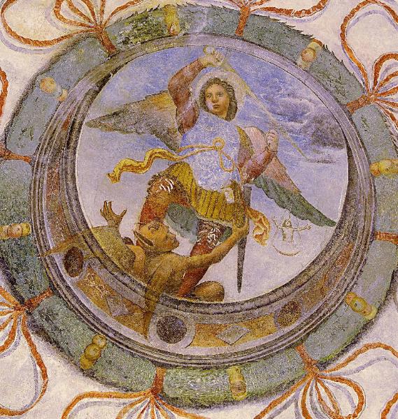 - NOTIZIE STORICO CRITICHE L'opera è stata riscoperta al di sotto della pittura settecentesca eseguita da Biagio Bellotti nella Sala capitolare, ed è quindi riconducibile ad un prima campagna di decorazioni degli ambienti interni della Certosa, avvenuta intorno ai primi anni del Cinquecento ed ispirata ai canoni bramanteschi. Il dipinto in questione è infatti esemplificativo di un'adesione si modelli umanistici e rinascimentali, sia per l'impianto architettonico illusionistico ricreato pittoricamente sulla volta, sia per la deformazione cui viene sottoposta la figura dell'angelo per sottolinearne la visione dal sottinsù. E' probabile che questa sala sia identificabile con la cappella dedicata a San Michele Arcangelo il cui altare, già consacrato nel 1426, fu secondo le fonti nuovamente consacrato il 25 agosto 1508. A questa data, dunque, il dipinto doveva già essere stato realizzato.\nLa critica ha suggerito per la paternità dell'opera il nome di Bernardo Zenale che, già attivo per i certosini di Pavia, potrebbe aver ricevuto la committenza anche per questo San Michele. La sua mano sarebbe riconoscibile soprattutto nella stesura degli incarnati, dipinti con pennellate dense e liscie, che definiscono abilmente volumi e modellato, seguendo la strada ormai aperta da Leonardo da Vinci nella trattazione dello sfumato per la resa dei volti. Indubbia rimane inoltre l'ispirazione fornita dall'opera dell'altra grande personalità presente nella Milano di quegli anni: Donato Bramante. A lui l'autore dell'affresco si ispira sia nella trattazione del finto oculo, che ricorda la decorazione a specchiature marmoree del tiburio di Santa Maria delle Grazie, sia nel rimando alle sue esperienze pittoriche quali i "Ritratti d'uomini d'arme" di Casa Visconti-Panigarola.