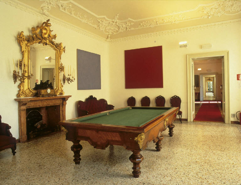 - NOTIZIE STORICO CRITICHE Fino quasi alla fine dell'Ottocento, la sala da biliardo era in realtà allestita nel locale successivo, mentre questo ambiente era adibito a "sala di conversazione". L'allestimento attuale curato da Giuseppe Panza costituisce un esempio straordinario del raffinato equilibrio studiato per ogni ambiente di Villa Panza tra arredi antichi, opere d'arte contemporanea e architettura storica. Il biliardo esposto, cronologicamente coerente con il resto dell'ambiente, proviene dalle collezioni della famiglia Panza, mentre ai Litta risale il gruppo di divani e sedie neorococò, tipici prodotti dello stile storicista in voga dalla metà del XIX secolo. I cosiddetti "mobili soffici" si distinguono infatti più per il profuso lavoro di tappezzeria che per l'intaglio ligneo, ridotto al minimo. Nello stesso tempo le nuove, abbondanti imbottiture capitonnè comunicano un senso di sicurezza e protezione, invitano all'intimità e, come richiesto dalla destinazione originaria della stanza, alla conversazione. Troviamo ancora decori neorococò nella coppia di consolles doratementre la grande specchiera baroccheggiante collocata sopra il camino ripropone i medesimi motivi aguzzi e a voluta appiattita che contraddistinguono gli stucchi del soffitto (terzo quarto del XIX secolo).\nI quadri monocromi di Phil Sims alle pareti Untitled (Cat. #139) del 1992, Untitled (SS023. Light Blue) del 1985, Untitled (Cat. #98) del 1986 e, sulla parete di destra, Untitled (Cat. MG 913) del 1991 sono stati acquistati da Giuseppe Panza e allestiti nell'ambiente negli anni Novanta del Novecento. Phil Sims (Richmond, 1940) conferisce al materiale cromatico una presenza tangibile, esplorando le possibilità espressive del monocromo. Per ognuno dei suoi lavori l'artista crea il colore artigianalmente ispirandosi alle tonalità naturali, dal giallo limone al color lavanda, al celeste: prepara il pigmento e lo mescola all'olio di lino secondo la consistenza desiderata per poi stenderlo sulla tela secondo un movimento a pennellate orizzontali e verticali, fino a costruire una trama sulla superficie. L'osservatore diventa partecipe del processo creativo cogliendo la gestualità dell'artista, intuendo la forma e la larghezza del pennello o pennellessa utilizzati e il rilievo materico del colore. Per ogni opera esiste un punto di osservazione preciso, ogni volta da ricercare in base alle condizioni di luce naturale, dal quale la trama scompare e la superficie cromatica diventa compatta sublimando il colore, che diventa una vibrazione luminosa nella quale immergersi.