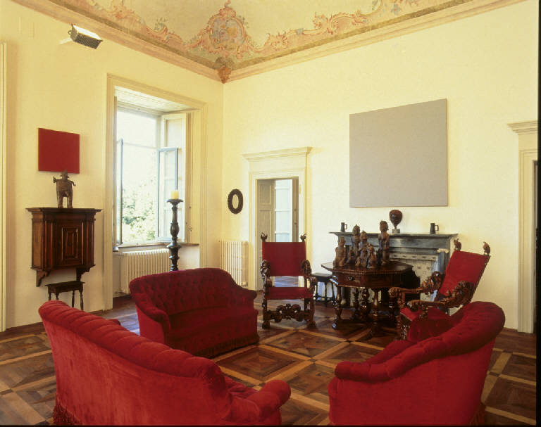 - NOTIZIE STORICO CRITICHE Collocato al primo piano della villa nell'ala nord, il salotto rosso è stato allestito dall'ultimo proprietario della villa Giuseppe Panza accostando opere d'arte contemporanea, arte primaria e arredi antichi per costruire una raffinata armonia. Il salotto rappresenta il cuore della villa perché qui Panza riunisce le sue tre grandi passioni: superando i tradizionali confini che tendono a distinguere tra arte ed etnografia o tra arte occidentale e arte extraeuropea, il collezionista accosta statue tribali a mobili dalle pure linee rinascimentali e dipinti di artisti contemporanei. Determinante, alla base di queste scelte, la convinzione dell'esistenza, in tutte queste forme artistiche, di una fonte d'ispirazione comune, cioè i medesimi valori di purezza, essenzialità ed espressività.\nI quadri di Ruth Ann Fredenthal (Detroit, 1938) Untitled n.9, 1975 (olio su tela di cotone), Untitled n. 130, 1987-1989 (olio su lino) e Untitled n. 121, 1984-1985 (olio su lino trattato) sono solo apparentemente di un solo colore, ma in realtà suddivisi in diversi settori da un'impercettibile cambiamento di tono lungo una linea ondulata, che è possibilie cogliere solo da un preciso punto di vista. \nParticolarmente degno di nota è il significato della collezione di Arte Primaria all'interno della raccolta di Giuseppe Panza, che comprende in totale circa sessanta oggetti in particolare di sculture provenienti dall'Africa e dal Messico precolombiano: in dialogo costante con la raccolta di arte contemporanea, nel comune intento di proporre nuovi modelli estetici e ampliare la capacità di comprensione del "diverso". Nei confronti dell'Arte Primaria, Giuseppe Panza non si pone dunque come il collezionista sistematico che vuole riunire la rappresentazione esaustiva di una cultura attraverso l'arte, e non è nemmeno lo specialista che si dedica puntigliosamente ad approfondire un unico settore o soggetto, ma cerca quegli apporti di profondo valore umano che alcune opere hanno conservato nel tempo. In questa ricerca, iniziata nel 1958 e portata avanti in parallelo al collezionismo di arte contemporanea, è fondamentale la figura di Franco Monti, collezionista di arte primaria, che nella primavera del 1958 organizza una mostra di arte primitiva con sculture precolombiane e africane alla galleria dell'Ariete a Milano. Il momento storico, all'inizio degli anni Sessanta, è inoltre favorevole agli acquisti per diversi motivi: la creazione di un mercato di questa arte in America, prima che venissero emanate leggi per proibire l'esportazione dei beni artistici, e il cambiamento di religione delle popolazioni, che passavano da quella animistica all'islamismo, che proibiva la raffigurazione della divinità e costringeva i fedeli alla distruzione delle immagini.\nLa cromìa originaria del soffitto settecentesco è stata scoperta durante la campagna di restauri del FAI sotto uno strato di intonaco bianco nel 1996.