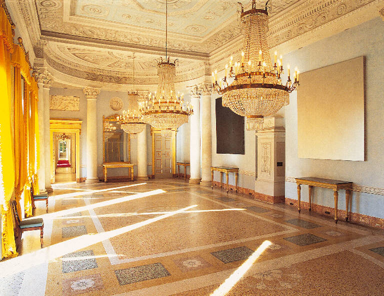 - NOTIZIE STORICO CRITICHE Il grandioso Salone decorato in stile impero è l'ambiente più sontuoso dell'intera villa. Costruito tra il 1829 e il 1830 per volere del duca Pompeo Litta Visconti Arese come ambiente di rappresentanza per ospitare banchetti e accomodare gli ospiti più prestigiosi, il salone viene progettato nell'insieme e in ogni suo minimo particolare della decorazione d'interni da Luigi Canonica, l'architetto di stato ufficiale in epoca napoleonica. Ispirandosi al gusto della grandeur napoleonica, così importante per le sorti della famiglia, Canonica costruisce un ambiente a forma di parallelepipedo all'esterno arrotondando internamente gli angoli e creando un ambiente ovale impreziosito da decorazioni classicheggianti. La data 1830 leggibile sulla lapide esterna della facciata, unita a quella rinvenuta, nel corso del recente restauro, nel cornicione della sala, che riporta "M F 1831", anno della definitiva inaugurazione del salone, rappresentano dei punti di riferimento precisi riguardo l'esecuzione del complesso decorativo e ne confermano l'inserimento cronologico all'interno del tardo stile Impero. Alla grandeur imperiale richiamano i motivi degli ornati: sfingi, mascheroni, trofei, palmette, rosette e girali vegetali ripresi dai modelli del mondo classico greco e romano e inquadrati in una moderna trama di quadrature e figure geometriche, ripetuta nei riquadri del pavimento a mosaico. Canonica si occupa si ogni particolare: disegna la geometria del pavimento a mosaico veneziano, consolles, specchiere, i profili delle porte, i lampadari di cristallo e l'elegante decorazione della stufa a parete, progetta il raffinato decoro a chiaroscuro del soffitto con figure mitologiche e inusuali bouquet di frutta e verdura, con gustosi particolari come ananas, carciofi, limoni e pere. La monumentalità classica della sala, sottolineata dalle grandi semicolonne corinzie e dai fregi in stucco con figure di putti, la simmetria e l'ordine vogliono simboleggiare l'ordine della situazione politica portata dall'impero napoleonico, al quale ricordo la nobiltà dei Litta rimane fedele fin dopo il suo declino.\nIn apparente contrasto, ma in raffinato e studiato equilibrio, vengono allestite da Giuseppe Panza due grandi opere dell'artista contemporaneo David Simpson (Pasadena, 1928) dalle cangianti cromìe, che riprendono i colori dell'ambiente in complesse variazioni che spaziano dal grigio, all'azzurro, al blu scuro, ogni volta diverse secondo l'incidenza della luce naturale che irrompe nell'ambiente dalle grandi porte finestre affacciate sul parco. I quadri di David Simpson sono solo apparentemente monocromi: a seconda delle condizioni atmosferiche e luminose, del punto di osservazione e del movimento la superficie cambia colore sotto gli occhi dell'osservatore. L'artista californiano inventa per i suoi lavori colori artificiali, non esistenti in natura: mescolando l'acrilico con la mica, pigmento metallico iridescente, crea colori cangianti e mutevoli, sovrapposti sulla tela di lino in vari strati a colpi di spatola: la gestualità dell'artista e i riflessi generano esperienze visive sempre mutevoli e fanno dell'opera un portale verso una dimensione nuova.