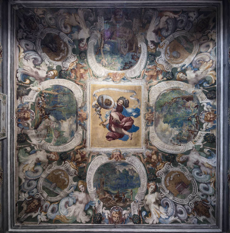 - NOTIZIE STORICO CRITICHE Il dipinto collocato al centro del soffitto raffigurante l'Allegoria della Fortezza viene ritenuto dalla critica opera dell'artista bolognese Camillo Procaccini, attivo nel Ninfeo di Villa Visconti Borromeo Litta nell'ultimo quarto del XVI secolo ed esecutore, insieme ai propri collaboratori, di buona parte degli affreschi presenti nel piano inferiore dell'edificio. A lui vengono attribuite in questa sala anche le "teste caricate" dipinte ai lati del riquadro centrale. L'artista, forte dell'esperienza maturata a Bologna dai Carracci, giunse infatti in una Milano estremamente curiosa nei confronti delle esasperazioni fisionomiche, fin dalle prime prove condotte da Leonardo da Vinci con le sue "Teste grottesche". Le bizzarrie ornamentali, alternate ad ornati a grottesche e motivi all'antica, corrispondevano infatti al gusto del committente del complesso, Pirro I Visconti Borromeo, nonché a quello dell'intero ambiente artistico lombardo che, a partire dall'inizio del XVI secolo, fece grandissimo uso di questo tipo di decorazioni. Il nuovo repertorio derivato dalle scoperte archeologiche romane, che all'epoca apparivano come grotte sotterranee (da cui il nome "grottesche"), venne infatti impiegato da scultori, orefici, intagliatori e pittori di tutta Europa, diffondendosi anche grazie ai numerosi repertori incisi e stampati a partire dalla metà del Cinquecento. Non è infatti un caso che Giovanni Paolo Lomazzo (1538-1592), consigliere di Pirro I Visconti Borromeo nella redazione del complesso iconografico della Villa, si fosse cimentato in gioventù proprio nella "composizione di grottesche" presso un intagliatore di ferro e materiali preziosi, e che draghi, bisce, arpie, centauri ed altre creature leggendarie fossero protagonisti delle sue fantasie di scrittore.\nLa volta della sala si presenta inoltre caratterizzata dalla raffigurazione di paesaggi bucolici, accesi da toni e luci cangianti soprattutto nella trattazione delle fronde degli alberi e nei borghi che si stagliano sullo sfondo. Queste raffigurazioni tradiscono un certo gusto nordico per le vedute fantastiche, riconducibile alla circolazione nella seconda metà del Cinquecento delle opere degli artisti fiamminghi Paul Bril e Jan Brueghel, favoriti in Lombardia anche dalle committenze del cardinale Federico Borromeo. La particolare vitalità di questi paesaggi, condotti non senza conoscere l'atmosfera dei "paesi di maniera" dipinti nell'Emilia della fine del XVI secolo, ha fatto propendere la critica per un'assegnazione al fratello minore di Camillo, Carlo Antonio Procaccini (1571-1630), apprezzato sia come paesaggista che come pittore di nature morte. Più difficile, invece, è identificare i brani pittorici affidati ai meno celebri Agostino Lodola e Giovan Battista Maestri, detto il Volpino, documentati al fianco del Procaccini intorno al 1602-1603 in alcune note di pagamento dell'amministrazione di Pirro I Visconti Borromeo.\nLa decorazione della sala prosegue anche sulle pareti, dove ampi cornici geometriche, divise in riquadri polilobati, racchiudono coloratissime ornamentazioni a volute e racemi floreali, che si chiudono intorno a raffigurazioni allegoriche di divinità mitologiche. Fra di esse l'immagine di Cupido, con arco e faretra, intento a recuperare una freccia tenuta tra le mani di una giovane donna seduta accanto a lui, che lo tiene tra le braccia, e la raffigurazione di una nereide (forse Galatea), una ninfa del mare riccamente ingioiellata seduta su un gigantesco mostro marino in cima ad una grotta, che ricorda le forme dell'attiguo Ninfeo. Anche la cappa del camino appare dipinta con la raffigurazione simbolica dei quattro elementi: al centro di un verde prato, è raffigurato un ardente falò le cui fiamme stanno per spegnersi sotto la pioggia portata da una nuvola raffigurata nella parte superiore della composizione. L'immagine è sovrastata da un cartiglio recante la scritta latina in lettere capitali "Auget" (= "aumenta"), probabilmente riferibile alla grandezza della famiglia Visconti Borromeo.