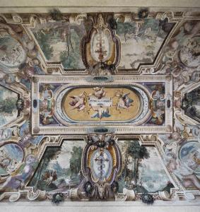 Al centro della volta compare un cartiglio recante la scritta latina "Omnia ab empyreo" (= "Tutto scende dal cielo"), sostenuto ai lati da quattro putti fortemente scorciati che sembrano visti dal sottinsù su un brillante fondale dorato. In corrispondenza dei due lati lunghi della sala, il medaglione centrale è circondato da due ricche cornici mistilinee contenenti un'interessante variante del simbolo dei Visconti: il caratteristico Biscione che divora il bambino avvolge infatti le sue spire intorno ad una spada di colore rosso, sormontata da una corona dorata. Ai lati degli stemmi, racchiuse tra ampie cornici architettoniche decorate con animali fantastici e teste grottesche, sono invece inserite scene di caccia, per terra e per mare, segno di grande varietà stilistica e interpretativa. Nelle pitture, infatti, sono raffigurate varie tecniche caratteristiche di numerose aree del mondo, che spaziano dalle battute di caccia nei boschi per catturare un toro imbizzarrito, all'esotico inseguimento di struzzi bianchi a cavallo o, ancora, dalla tradizionale pesca su fiume, per poi concludere con la cattura delle balene in mare aperto.