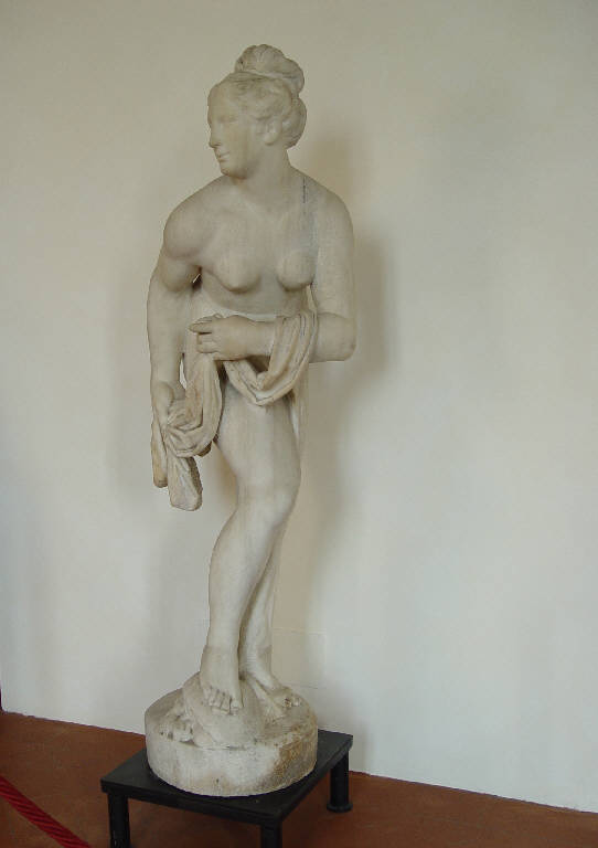 - NOTIZIE STORICO CRITICHE La statua di "Venere al bagno" costituisce una tra le più pregevoli opere conservate nel "Corridoio delle statue" sito al piano nobile della Villa. Essa era originariamente collocata nelle "Grotte Vecchie" del Ninfeo, nel quale oggi è presente una copia identica all'originale. Questa scultura venne infatti scolpita per essere scenograficamente disposta nell'emiciclo delle grotte naturali situato nella zona orientale del Ninfeo, insieme ad altre due figure di Naiadi-Veneri realizzate intorno al 1589 da Giulio Cesare Procaccini su disegno dello scultore Francesco Brambilla il Giovane. Questa "Venere al bagno" viene invece assegnata dalla critica ad un altro scultore attivo nel complesso, il comasco Marco Antonio Prestinari, sulla base delle similitudini con l'"Adone" da lui scolpito nel marmo nel 1602 per il giardino del Ninfeo e oggi conservato al Musée du Louvre di Parigi. In entrambe queste opere, infatti, Prestinari traduce i modelli del Brambilla con un linguaggio differente da quello procacciniano e più vicino alle sculture del celebre artista Giambologna, di cui riprende in maniera evidente l'opera "Venus Urania" (1575), oggi conservata al Kunsthistorisches Museum di Vienna. Tutte queste sculture tradiscono inoltre una certa suggestione della "Leda" dipinta da Leonardo da Vinci, così come poteva essere percepita studiando il cartone dell'artista allora conservato a Milano nella Collezione Leoni (e oggi perduto), oppure le numerose traduzioni pittoriche fatte dagli allievi del maestro fiorentino. Sicuramente Giovanni Paolo Lomazzo, regista insieme a Pirro I Visconti Borromeo del progetto iconografico e decorativo del Ninfeo, doveva aver sostenuto una certa vena leonardesca negli scultori attivi all'interno della Villa. In particolare nei suoi numerosi scritti appare chiaro come egli considerasse "Leda" come un vertice di perfezione estetico-culturale e come un supremo modello da seguire per raffigurare Venere, i cui volti regolari e affilati presentano il caratteristico ed enigmatico sorriso delle dame leonardesche, così come la stessa attenta definizione delle morbide acconciature a ciocche ondulate.\nLa scultura della Venere si è guadagnata negli anni l'appellativo popolare di "Vegia Tuntona", che nel dialetto locale significa "Vecchia Tentatrice". Le tradizioni orali, infatti, raccontano che i lainatesi, che non avevano accesso agli ambienti della villa e del parco pertinenziali, si arrampicavano appositamente sul muro esterno del Ninfeo per guardare all'interno dell'unica finestra aperta sulla città, dalla quale si poteva scorgere in controluce la sagoma sinuosa della dea in posa lasciva mentre veniva bagnata dagli spruzzi d'acqua, apparendo come un'irresistibile tentatrice, immobile e irraggiungibile.
