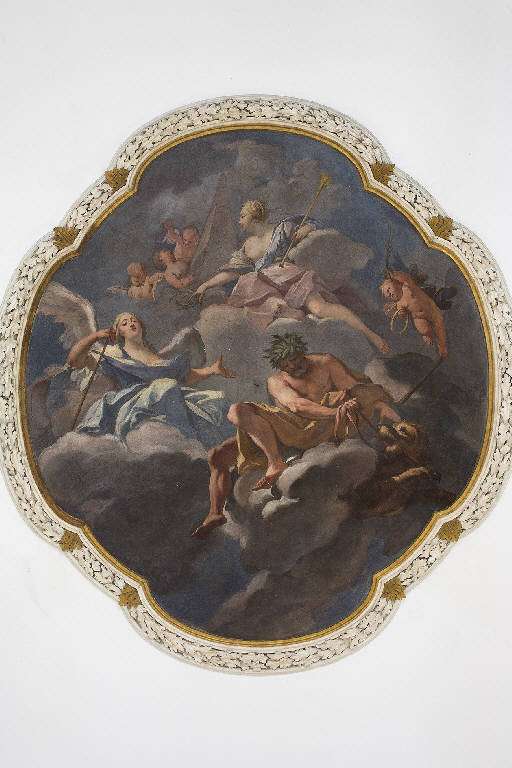 - NOTIZIE STORICO CRITICHE Posta al piano terra della villa ed oggi adibita ad aula scolastica, in adiacenza all'altra stanza ancora affrescata denominata "Sala di Cerere, Pomona e Saturno", la "Sala del Cannocchiale" fu decorata dal pittore cremonese-milanese Giovanni Angelo Borroni. Egli vi lavorò su commissione di Giuseppe Angelo Crivelli nell'ambito della ristrutturazione della villa avvenuta dopo l'acquisizione da parte dei Crivelli. \nL'opera viene fatta risalire agli anni quaranta del Settecento per via dello stile utilizzato dall'artista, che ricorda i cicli pittorici da lui realizzati tra il 1730 e il 1753 per i palazzi milanesi Clerici, Cusani e Stanga e per le ville Alari Visconti a Cernusco e Carones Brentano a Corbetta. La carriera del Borroni fu infatti da sempre legata alla benevolenza della famiglia Crivelli. Fu infatti a spese della famiglia di Giuseppe Angelo che l'artista venne inviato a Bologna a perfezionare il suo stile. Stefano Gaetano Crivelli, inoltre, fu padrino di una delle figlie del pittore, diventato ormai artista di fiducia della famiglia. Lo stile del pittore è caratterizzato da un classicismo misurato, arricchito da componenti tipicamente rococò e da influenze tratte da alcuni dei più importanti artisti a lui coevi, quali ad esempio Pietro Antonio Magatti, alle cui particolarissime cromie azzurraste e forme allungate si rifanno le figure della Vittoria e di Giunone.\nQui il Borroni si misura con un soggetto mitologico dalla forte valenza simbolica, con il quale la famiglia Crivelli intese dichiarare piena fedeltà alla corona asburgica e partecipare al lutto dell'imperatrice Maria Teresa d'Austria per la perdita del padre Carlo VI d'Asburgo, avvenuta il 20 ottobre 1740. La raffigurazione, dall'articolata composizione, cela infatti precisi riferimenti alla storia e ai personaggi del tempo: Ercole, che sebbene non più giovanissimo mostra qui ancora la sua possenza muscolare, identifica le vittorie di Carlo VI d'Asburgo sulla Francia e l'Impero Ottomano conclusesi tra 1713 e il 1718. La Vittoria dormiente, invece, ricorda la conclusione della pace di Vienna del 1738 e dalla Pace di Belgrado del 1739 sempre ad opera del defunto imperatore. Nella parte superiore del dipinto la figlia Maria Teresa d'Austria, rappresentata come Giunone regina del cielo, rende omaggio alla tomba del padre con una corona d'alloro: serenamente essa accetta il proprio destino di succedere al trono paterno, come suggerisce il piccolo erote che si avvicina alla donna con in mano la corona imperiale.