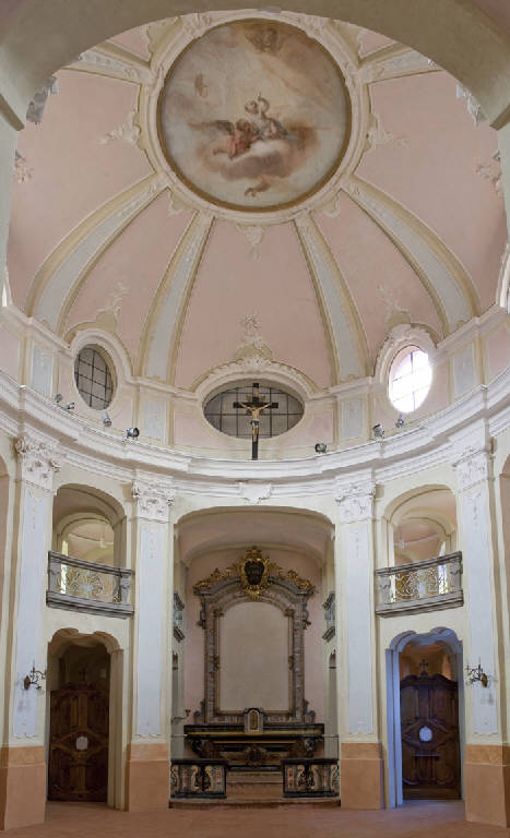 - NOTIZIE STORICO CRITICHE La Cappella di Santa Maria Assunta e San Francesco, oggi completamente autonoma ma un tempo collegata da un camminamento al resto della Villa, assunse le attuali sembianze a partire dal 1754, quando fu riaperta al culto dopo alcuni interventi di rinnovamento curati dall'architetto Francesco Croce, attuati nell'ambito di un più vasto progetto di recupero ed ammodernamento del complesso limbiatese voluto dal proprietario Stefano Gaetano Crivelli.\nI dipinti posti sulla volta e le pareti laterali della cappella sono stati attribuiti dalla critica a Giovan Angelo Borroni, pittore vicino alla famiglia Crivelli e autore del ciclo di affreschi interno alla villa risalenti alla prima metà del XVIII secolo. È plausibile ritenere che le decorazioni interne siano state realizzate a partire dall'anno precedente la consacrazione della cappella (1754), nel momento di piena maturità del Borroni: le differenze di tratto rispetto agli affreschi presenti all'interno della villa possono essere dovute alla presenza, accanto al Borroni, del figlio Vincenzo. Per quanto riguarda i soggetti scelti, essi riassumono la religiosità del committente e, in particolare, la sua devozione alle figure angeliche, molto diffusa negli anni di definizione del culto dell'Angelo custode. Quanto alla scena raffigurante solo santi, in essa si possono ritrovare i santi onomastici del committente (Stefano e Gaetano) mentre gli altri vennero probabilmente scelti per motivi di devozione familiare, non collegati direttamente ai nomi degli eredi (i figli del Crivelli si chiamavano, infatti: Maria Anna, Giovanni, Giovanna e Ignazio Michele). San Michele Arcangelo era, inoltre, un evidente riferimento al suffragio dei defunti, che richiamava il desiderio della famiglia Crivelli di trasformare la cappella nel proprio mausoleo.\nLa cappella era in origine decorata anche con una grande pala d'altare raffigurante la Madonna venerata dai santi Giovanni Battista e Dalmazio, dipinta da Bernardino Campi nel 1569 ed acquistata direttamente da Stefano Gaetano Crivelli. L'opera originaria, oggi in deposito presso Palazzo Isimbardi a Milano, era stata sostituita in loco da una copia, trafugata nel gennaio 2015.