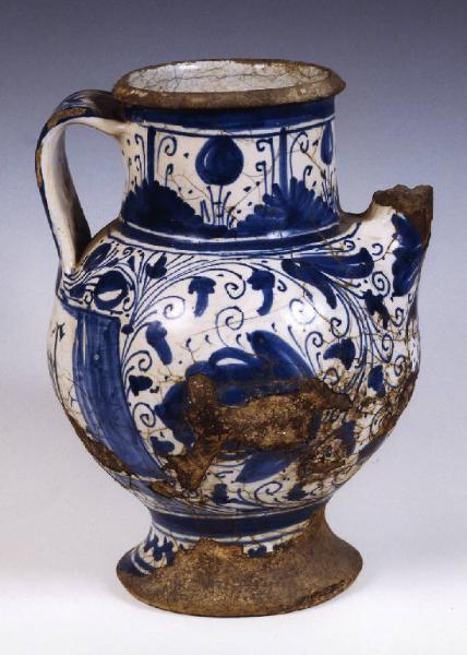 Contenitore con ansa decorata; il corpo dalla forma ovoidale e slanciata ha collo alto e largo, con orlo rinforzato e beccuccio a cannone.