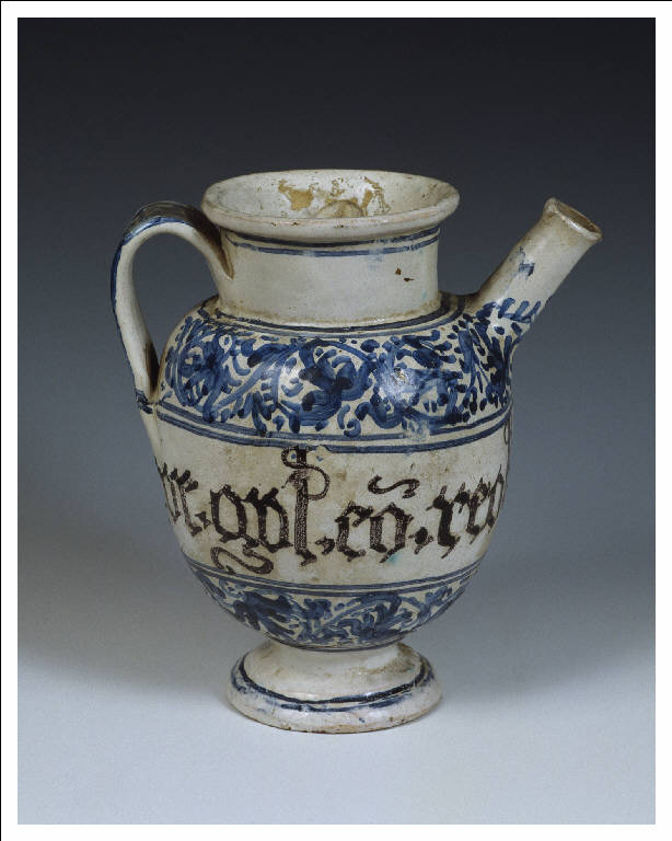 Contenitore con ansa piatta a nastro, decorata; il corpo dalla forma globulare, slanciata su alto piede, ha collo dritto con orlo rinforzato e beccuccio a cannone.
