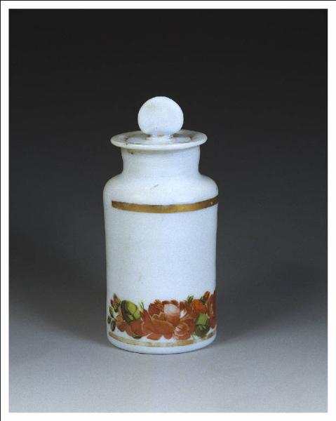 Contenitore da polveri con corpo cilindrico dritto su piede piatto; il collo è stretto e alto; l'ampia bocca dall'orlo estroflesso è predisposta per il largo tappo tondo con presa a ventaglio.