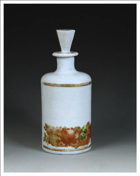 Contenitore da liquidi con corpo cilindrico dritto su piede piatto; il collo è stretto e alto; la bocca dall'orlo estroflesso è predisposta per il tappo alto, sfaccettato e rastremato.