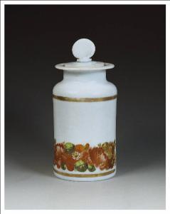 Contenitore da polveri con corpo cilindrico dritto su piede piatto; il collo è stretto e alto; l'ampia bocca dall'orlo estroflesso è predisposta per il largo tappo tondo con presa a ventaglio.