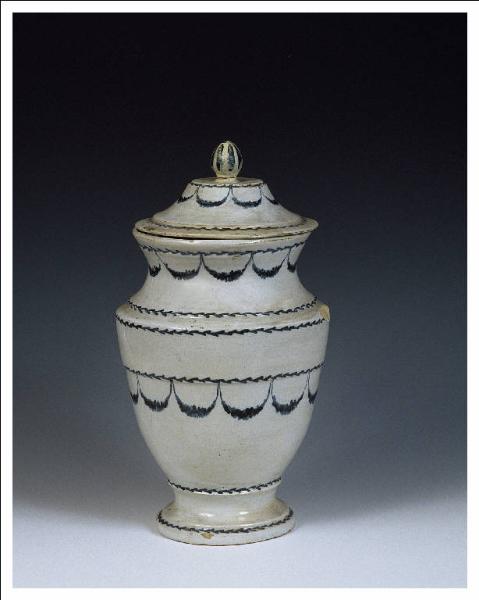Contenitore con corpo a balaustro su alta base digradante; l'ampio collo svasato è chiuso da coperchio ad incastro con pomolo.