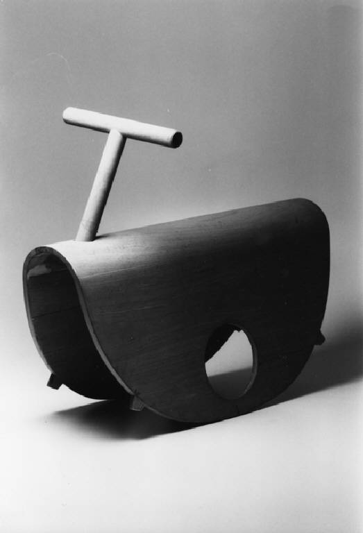 Modello di studio per una rivisitazione del tradizionale giocattolo per bambini. Il cavallo a dondolo in questo progetto non ripropone le forme del cavallo ma le sostituisce con le finiture (ovvero gli accessori indossati dal cavallo quando viene cavalcato): sella, staffe e redini.