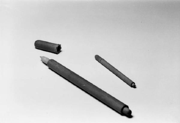 Modello di studio per pennarello caratterizzato dal tappo con ghiera dentata che oltre a favorirne l'apertura ne impediva il rotolamento sul piano. Morfologicamente appare come un insieme di tre cilindri coassiali di diametro crescente: la punta del pennarello; l'impugnatura e, all'estremo opposto, l'aggancio del tappo durante la scrittura; il corpo del pennarello.