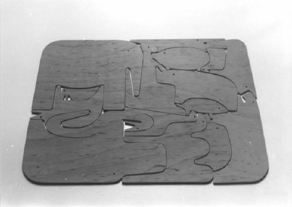 Modello di studio di gioco ad incastro per bambini. E' composto da sedici sagome stilizzate di animali. Se posizionate in maniera corretta le figure formano un rettangolo dagli angoli arrotondati.
