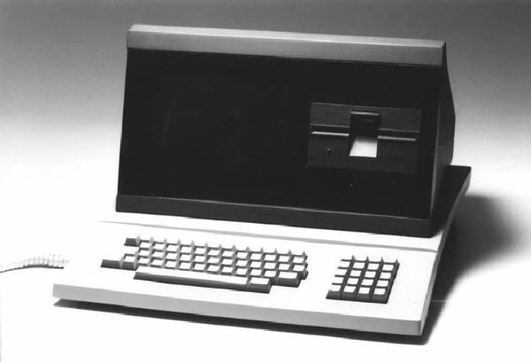 Modello di studio per computer da tavolo costituito da una base (contenente la tastiera) e da un corpo superiore prismatico a sezione trapezoidale (contenente lo schermoa tubo catodico e il lettore per i floppy-disk).