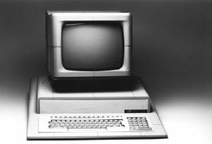 Modello di studio per computer da tavolo costituito da due parti ben distinte: una base prismatica contenente la tastiera e i vari componenti; un monitor a tubo catodico.