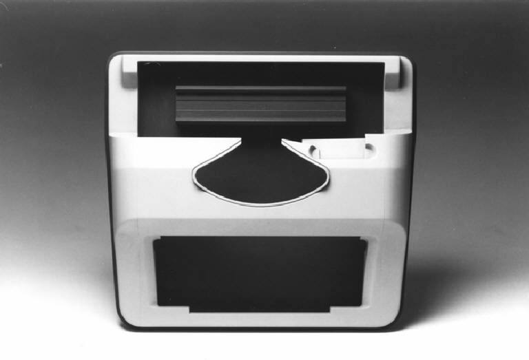 Modello di studio della scocca di una macchina da scrivere meccanica a carrello scorrevole lateralmente. Rispetto al modello della scheda 62 presenta un'articolazione volumetrica più elaborata e una apertura più larga in corrispondenza delle leve dei caratteri.