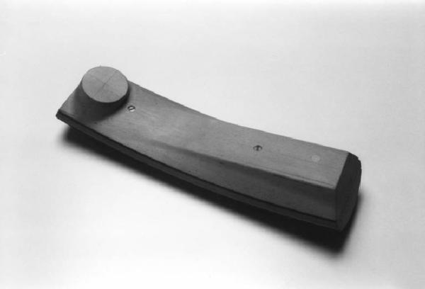 Modello di studio per cornetta telefonica morfologicamente assimilabile ad una lastra a pianta rettangolare leggermente curvata, dalla quale emergono l'auricolare (realizzato con un tozzo cilindro) e il microfono (ottenuto con un aumento di spessore della lastra, poi rastremata sia in altezza che in profondità).