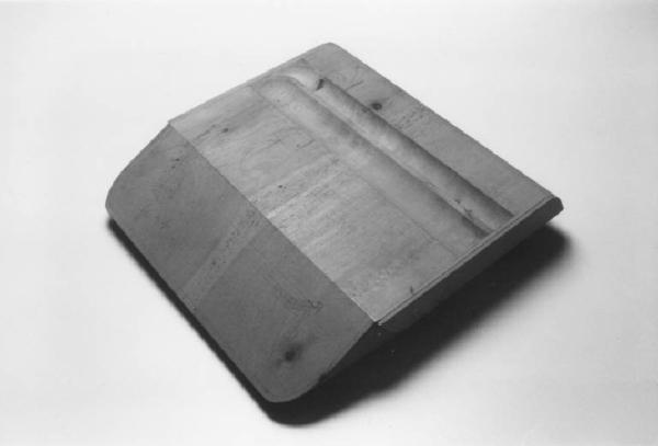 Modello di studio per portaoggetti da tavolo costituito da un solido prismatico a pianta rettangolare e sezione variabile (la parte anteriore è sezionata con un angolo di 30° a favore dell'utilizzatore) e dotato di due scanalature a tutta larghezza nella parte posteriore.