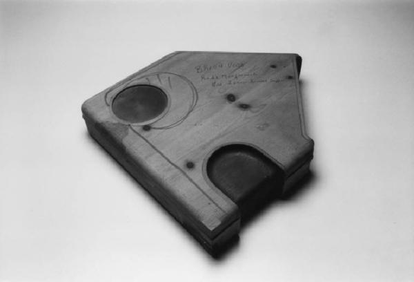 Modello di studio per radio mangianastri costituito da un solido prismatico a pianta pentagonale dagli spigoli smussati nel quale sono stati ricavati, tramite una riduzione di spessore, due asole (una circolare e l'altra semicircolare).