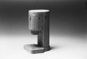 Modello di studio per macchina da caffè espresso per uso domestico. Il corpo è ottenuto da un prisma a pianta ellittica scavato per metà nella parte inferiore per permettere l'inserimento della tazzina da riempire. Tale corpo è sorretto da una base realizzata con un solido prismatico a pianta rettangolare con gli angoli smussati.