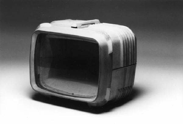 Modello di studio per televisore che avrebbe dovuto essere realizzato in gomma. E' un solido prismatico a pianta e sezione rettangolare con gli angoli arrotondati. Presenta numerose nervatura nella parte posteriore , continue su quattro lati, e una maniglia sul lato superiore in posizione perpendizolare rispetto al piano dello schermo.
